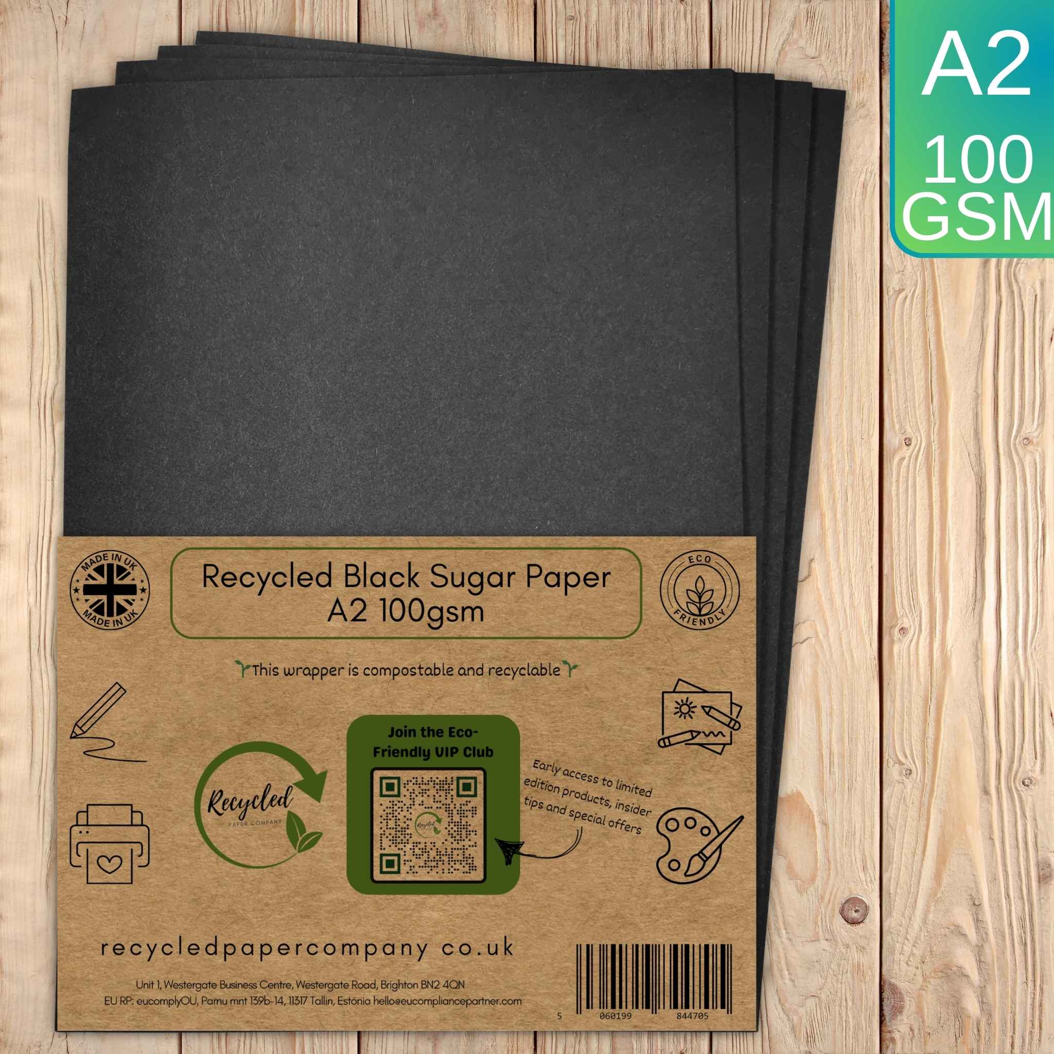Our 100% recycled black sugar paper is a great value buy and is just what you need for creating amazing craftwork. This paper is 100 gsm (that is about 140 micron) is suitable for children's art, craft and school projects. Our sugar paper is slightly rough with unfinished surface and it's perfect for drawing, sketching or colouring with pastels and crayons.